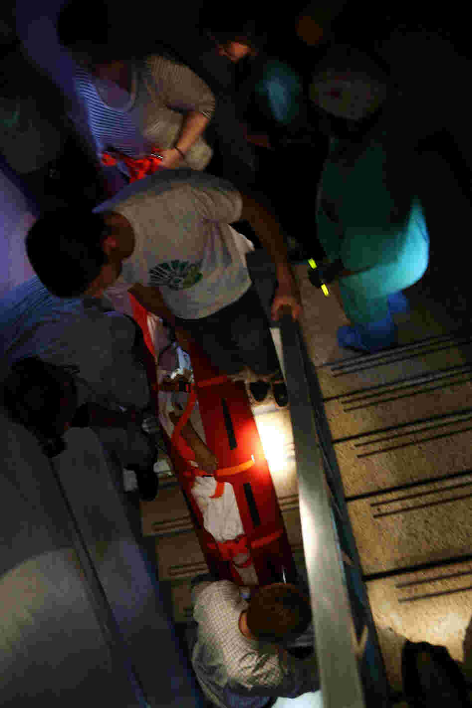 "Many patients were too sick to walk down the narrow staircase to the lobby," LaPook writes. "They were painstakingly carried on plastic sleds â" one by one â" by teams of four to five people from as high up as the 17th floor."