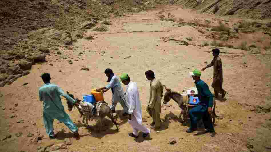 Health workers transport the polio vaccine by donkey in southeastern Pakistan.