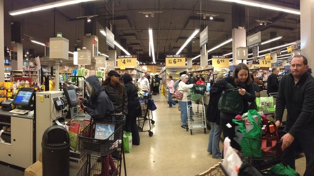 People wait to purchase groceries in self-checkout lanes at Safeway in Washington, D.C.
