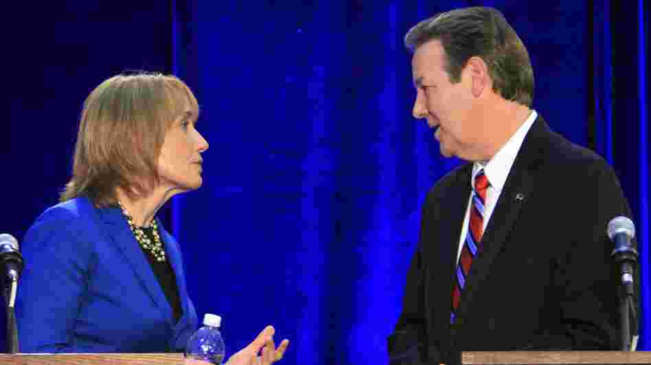 Democrat Maggie Hassan and Republican Ovide Lamontagne talk during a break in their gubernatorial debate in Henniker, N.H., on Oct. 4.