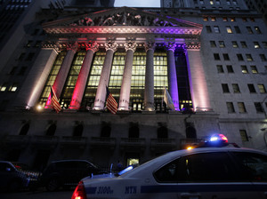 A police car patrols in front of the New York Stock Exchange on Wednesday before it reopens for trading for the first time since Friday.
