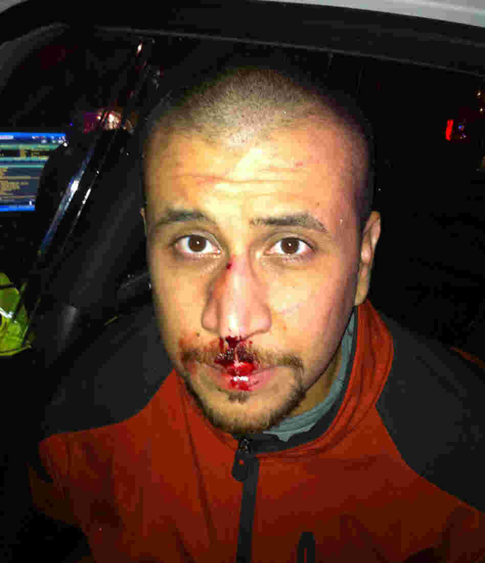 The image, taken by a police officer, shows blood dripping down Zimmerman's face and his nose appears to be swollen. The photograph was released by Zimmerman's defense attorney.
